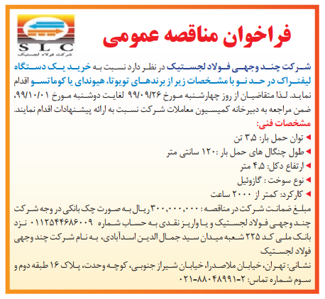 شرکت چند وجهی فولاد لجستیک در نظر دارد نسبت به خرید یک دستگاه لیفتراک در حد نو با مشخصات زیر از برندهای تویوتا، هیوندای یا کوماتسو اقدام نماید. لذا متقاضیان از روز چهارشنبه مورخ 1399/09/26 لغایت دوشنبه مورخ 1399/10/01، ضمن مراجعه به دبیرخانه کمیسیون معاملات شرکت نسبت به ارائه پیشنهادات اقدام نمایند.