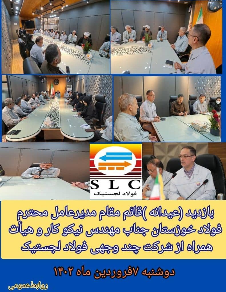 بازدید نوروزی دوشنبه هفتم فروردین ماه با حضورمهندس نیکو کار قائم مقام مدیرعامل محترم شرکت فولادخوزستان ،مهندس تقوی معاونت منابع انسانی،جناب مهندس حسن پور مدیربازرسی و نظارت ،جناب علیدادی فرمانده حوزه مقاومت بسیج شهید بقایی ،حجت الاسلام موسی بهاالدینی سرپرست امور ایثارگران با کارکنان شرکت چندوجهی فولادلجستیک