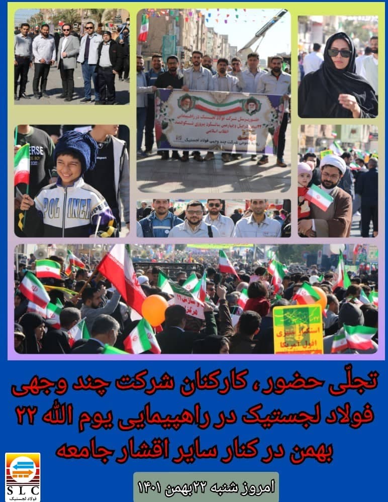 به گزارش روابط عمومی شرکت چند وجهی فولاد لجستیک امروز شنبه ۲۲بهمن ۱۴۰۱ کارکنان شرکت چند وجهی فولاد لجستیک، در راهپیمایی حضور داشتند. در این روز حضور پر شور مردم در جشن ۴۴ سالگی انقلاب اسلامی ازدقایق اولیه آغاز شد که کارکنان شرکت چند وجهی فولاد لجستیک با مردم انقلابی استان خوزستان از ساعات ابتدایی صبح در مسیرهای راهپیمایی حضور یافتنهاند تا بار دیگر اتحاد و انسجام ملی خود را به گوش جهانیان برسانند.