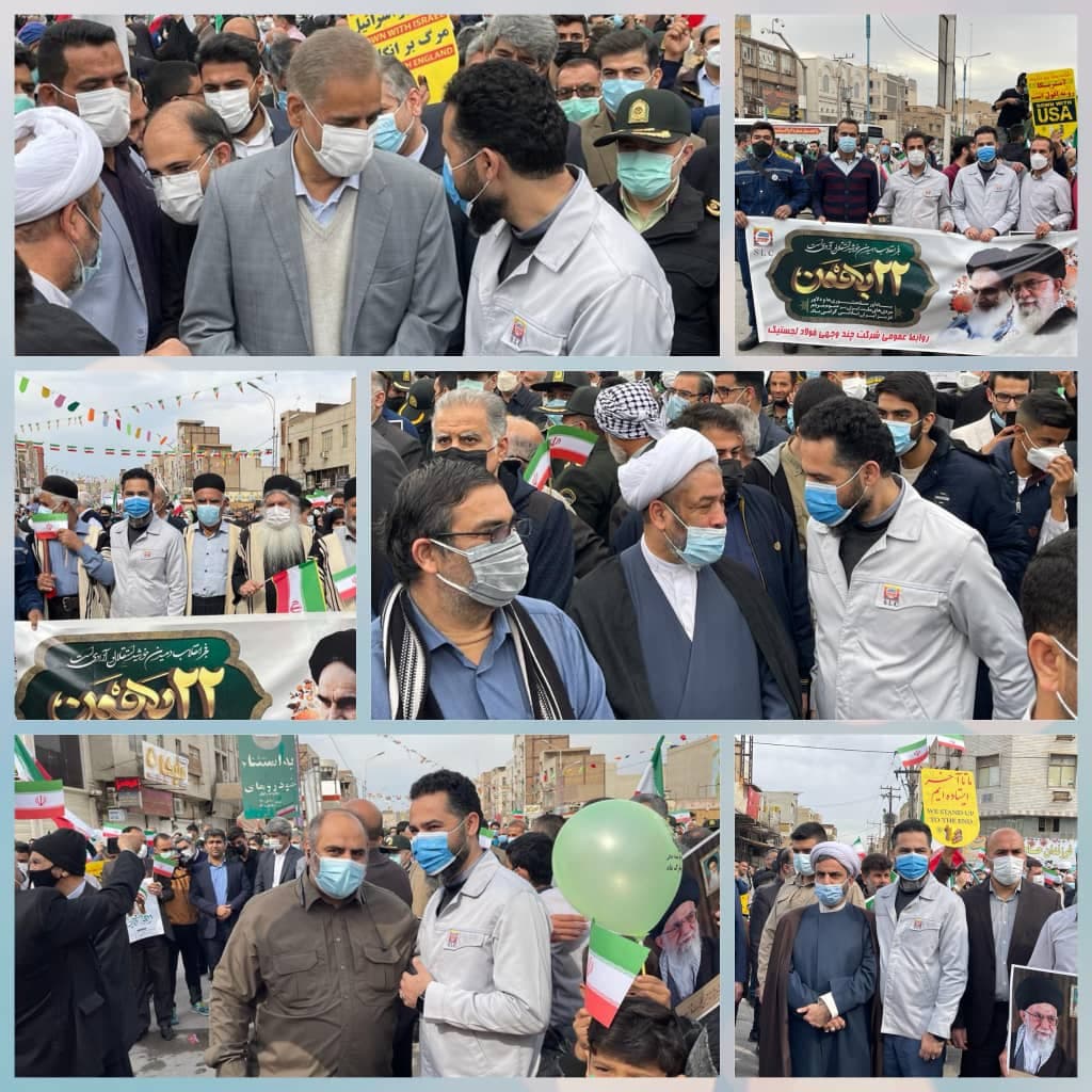به گزارش روابط عمومی شرکت چند وجهی فولاد لجستیک راهپیمایی یوم الله 22 بهمن ماه، امسال نیز با حضور پرشور مردم در سراسر کشور و استان خوزستان برگزار و مردم چهل و سومین پیروزی انقلاب را جشن گرفتند.