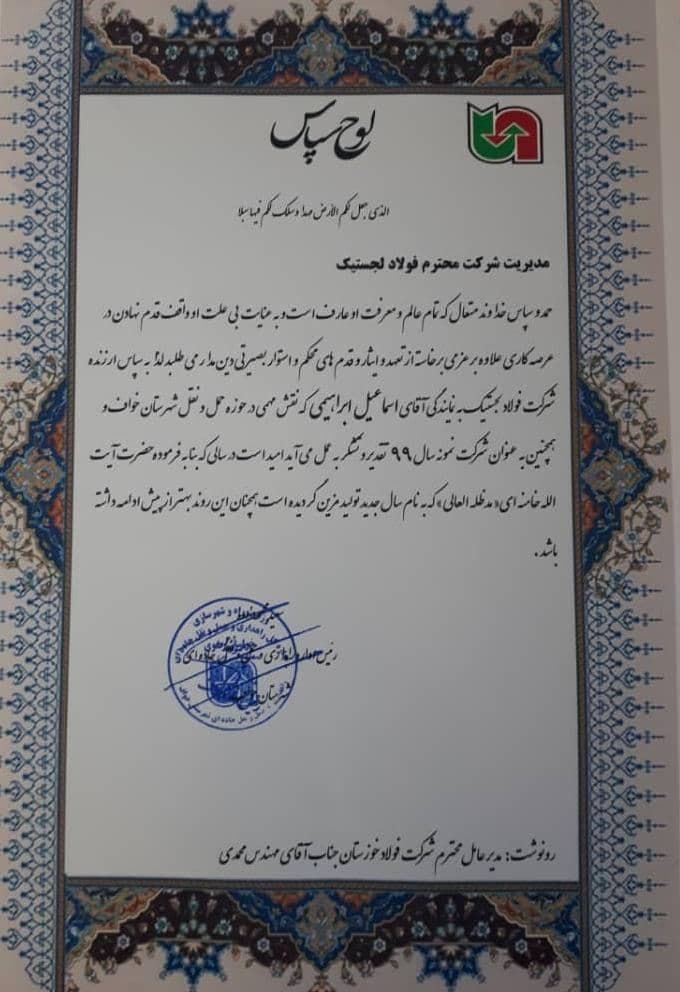 لوح تقدیر شرکت نمونه در سال ۹۹ توسط اداره کل راهداری و حمل و نقل جاده ای شهرستان خواف به شرکت فولاد لجستیک اهدا شد.